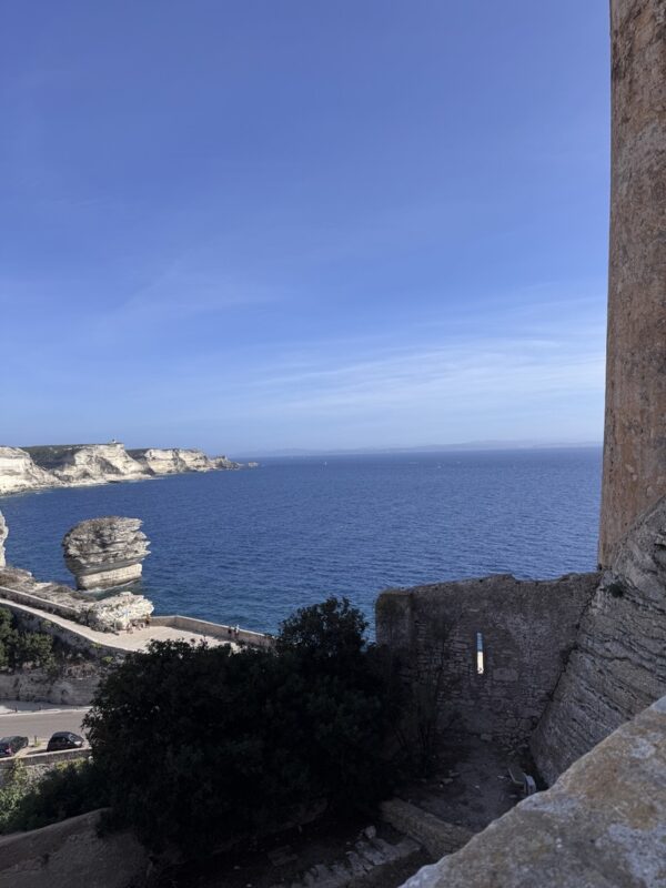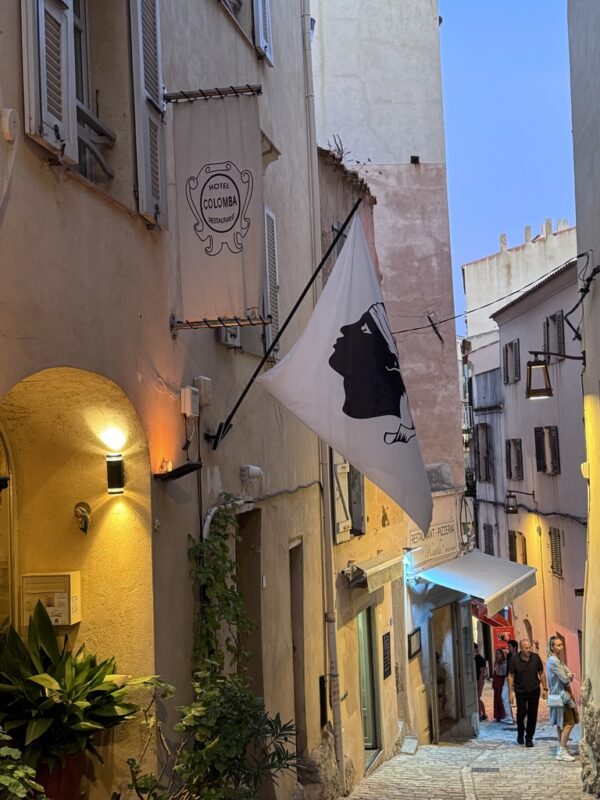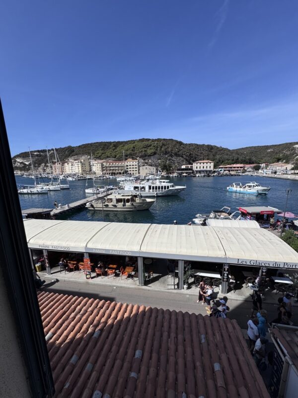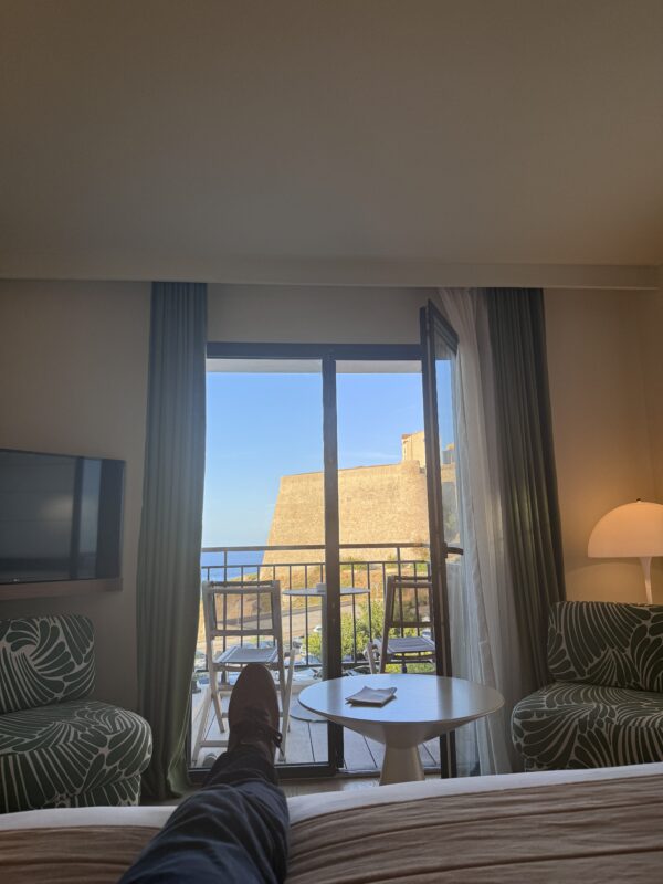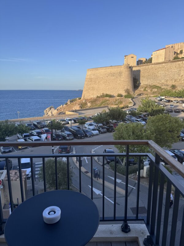 Was wir allerdings nicht fanden: einen Parkplatz. Die Polizei hatte wegen einer Prozession sämtliche Straßen gesperrt. Warum, wieso, weshalb? Keine Ahnung. Frankreich halt. Karin hat das professionell gelöst: Sie ist mit den Koffern ausgestiegen, hat eingecheckt – und zack! Wieder ein Upgrade. Dieses Mal fürs Zimmer: 3. Stock, direkter Meerblick vom Bett aus. Wenn’s dafür Punkte gäbe, wäre das glatt die Champions League der Hotelzimmer. Das Kasano war ein Volltreffer. Geschmackvoller als Stefans Lieblingsbier, mit allem, was man braucht – und direktem Blick auf die Citadelle von Calvi. Eingebettet in die malerische Altstadt, zwischen kleinen Gassen, Bougainvillea und dem Duft von Macchia und Espresso, konnten wir nur sagen: „Oui, bitte!“
