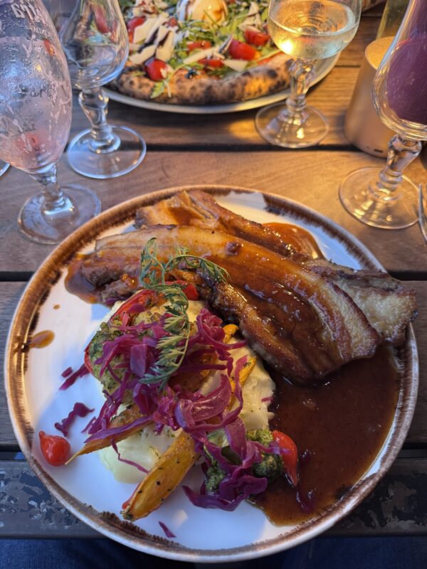 Karin bestellte eine Pizza, die alles hatte, was eine Pizza haben muss – inklusive Teig, der in Deutschland vermutlich als UNESCO-Weltkulturerbe durchgehen würde. Stefan entschied sich für kandierten Schweinebauch mit Kartoffelpüree – eine Kombination, die er sonst nur aus seinen wildesten Träumen kennt. Ergebnis: Sprachlosigkeit. Und das bei Stefan!