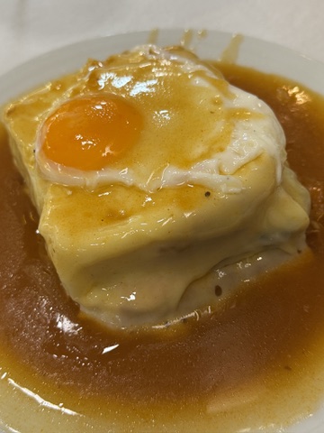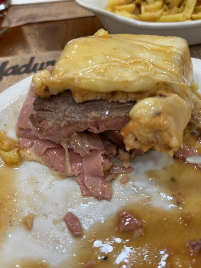 Innen besteht Franceshina aus einer Lage Toast, dann gekochter Schinken, halbierte würzige Würstchen, eine Lage Toast, dann ein komplettes Rindersteak und wieder eine Lage Toast. Wie gesagt wird dann das Ganze mit dick Käse überbacken und mit einem Spiegelei getoppt. Zu guter Letzt wird das Ganze noch mit würziger Tomatensoße übergossen. Ach ja, Pommes gibt’s natürlich auch noch dazu… Kalorien? Fragt bloß nicht, aber saugeil!!!!